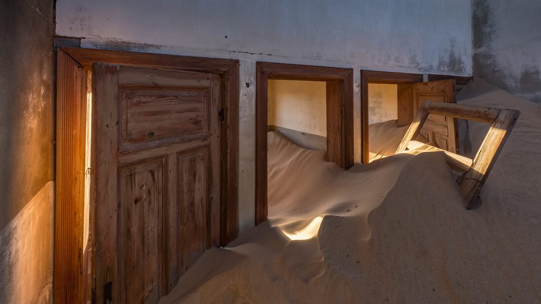 Kolmanskop is a town that used to be home to miners that worked at the Elizabeth Bay diamond mine in Namibia. Abandoned long ago, the Namib desert is gradually reclaiming the land with the dwellings once occupied with hard-working miners and their possession now filled with sand. Day 4 of a 12-day photographic workshop in March 2019 brought our small Aussie team to this haunting location. We arrived around 5:30am in darkness waiting for sunrise and the morning “golden hour”.