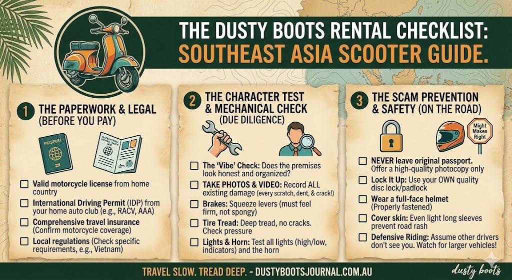 - The photo proof: Take a video of every scratch, dent, and cracked mirror. Rental shops are notorious for claiming ‘new’ damage when you return the bike.